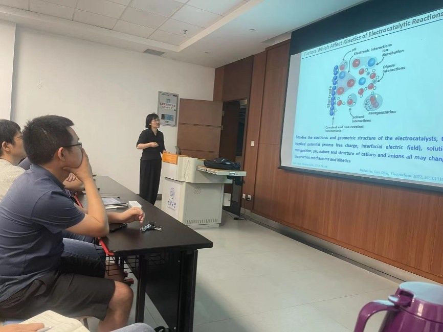 讲座主题主要围绕“发生在电催化剂/电解质界面的电催化反应同时受到电催化剂的催化作用以及电催化剂/电解质界面环境,界面荷电,界面电场以及电解质离子与溶剂的调控作用”展开。陈艳霞教授指出“定量分析各种作用对总反应动力学的影响是揭示电极过程动力学”的关键,也将对建立能严格定量描述电催化反应理论提供重要依据。在本讲座中, 陈艳霞教授以Au(111)电极上的氢析出反应为模型体系,介绍如何结合系统的实验与计算模拟扣除静电双电层效应的影响,从而得到该反应的本征动力学参数,并揭示扣除这些干扰因素后与文献主流观点不一致的氢析出反应的pH效应,并简要讨论关于氢电极反应的 pH效应起源的几种主流观点的适用性。在讲座尾声,陈艳霞教授还与师生就研究工作中的困惑,难点等进行了热烈的互动交流,为大家解惑,讲座现场氛围融洽。本次讲座不仅展示了陈艳霞教授在相关领域的深厚造诣,也为在场师生带来了宝贵的学术收获和启发。