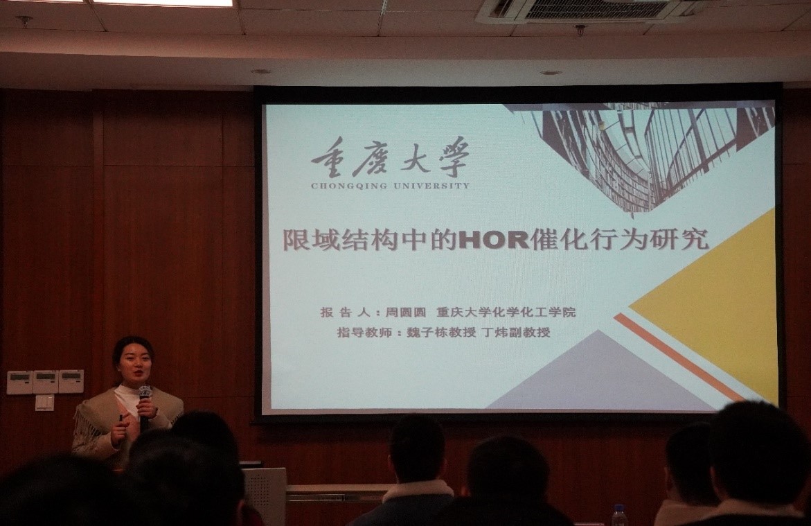 博士研究生周圆圆首先进行报告,她以“限域结构中的HOR催化行为研究”为主题,介绍了自己发表在nature catalysis的论文以及目前进行的量子限域效应工作。讲解生动有趣,同学们饶有兴致。随后分享自己在科研过程中的经验和感悟,同学们受益匪浅。