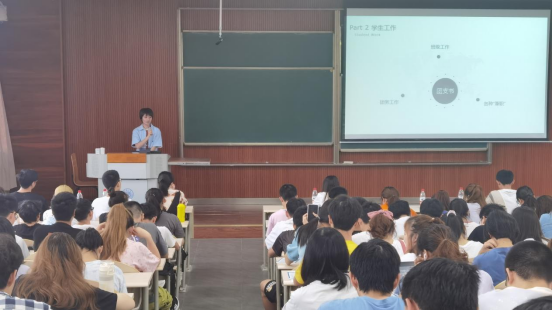 虎溪校区第一教学楼D1533正式召开。辅导员伍丽主持, 2020级全体学生出席,特别邀请到三位优秀高年级嘉宾分享经验。