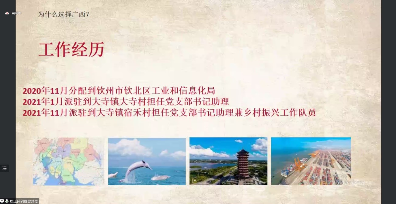 接着,周玉萍学姐向我们介绍了她考入选调生后的工作经历。她被分配到大寺镇大寺村担任党支部书记助理,和村干部一起入户调查,组织村民举办红色文艺活动,以及开设党课宣传党的精神。从最开始的陌生到现在逐渐亲近,她将自己的青春献给基层,全心全意建设好美丽乡村。